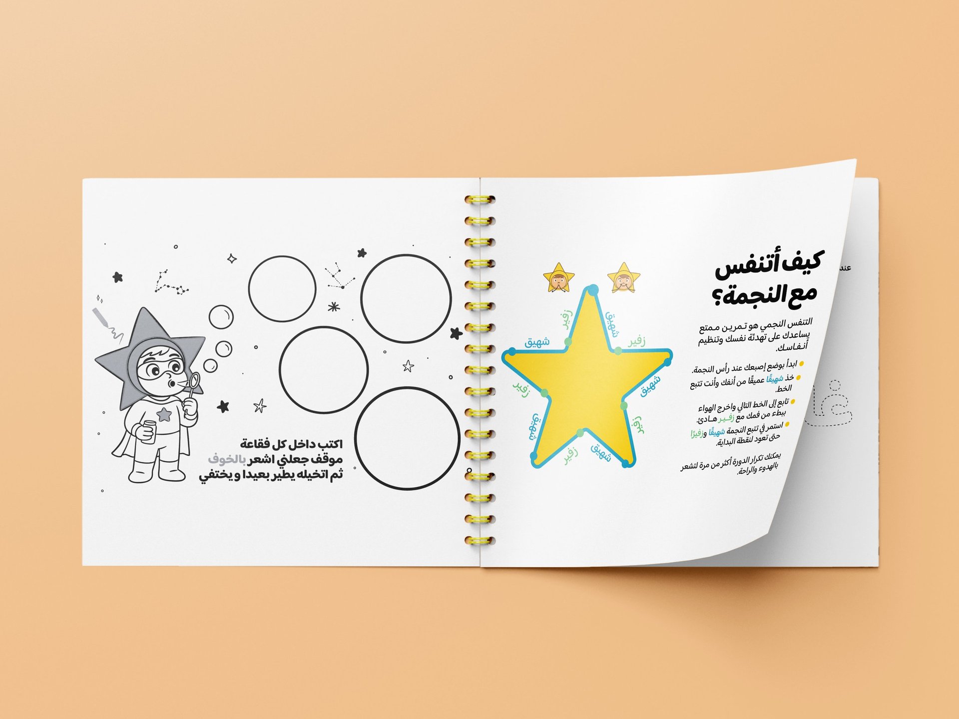 أدوات للتهدئة والتأمل مثل تمارين التنفس البسيطة، وصفحات للمساعدة في تنظيم المشاعر وقت الغضب أو الحزن.